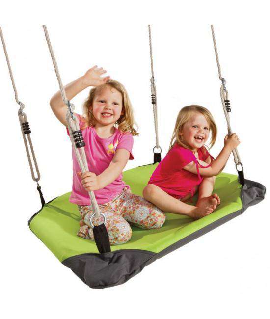 A small drain hole allows the rainwater to flow away freely. The steel frame is padded all around to ensure a soft impact. The fabric material is both strong and comfortable to the touch. It is intended to use in combination with the duo seat swing hook. The rings and eights are made in galvanised steel. The welds on the ropes are made in black PP.