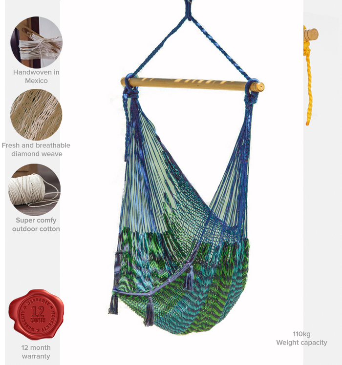 Introducing our new premium quality Mexican hammock chairs in Carib colour with the bonus of a comfy ergonomic back support, difficult to find elsewhere, these Mexican hammock chairs are brilliant to swing in.