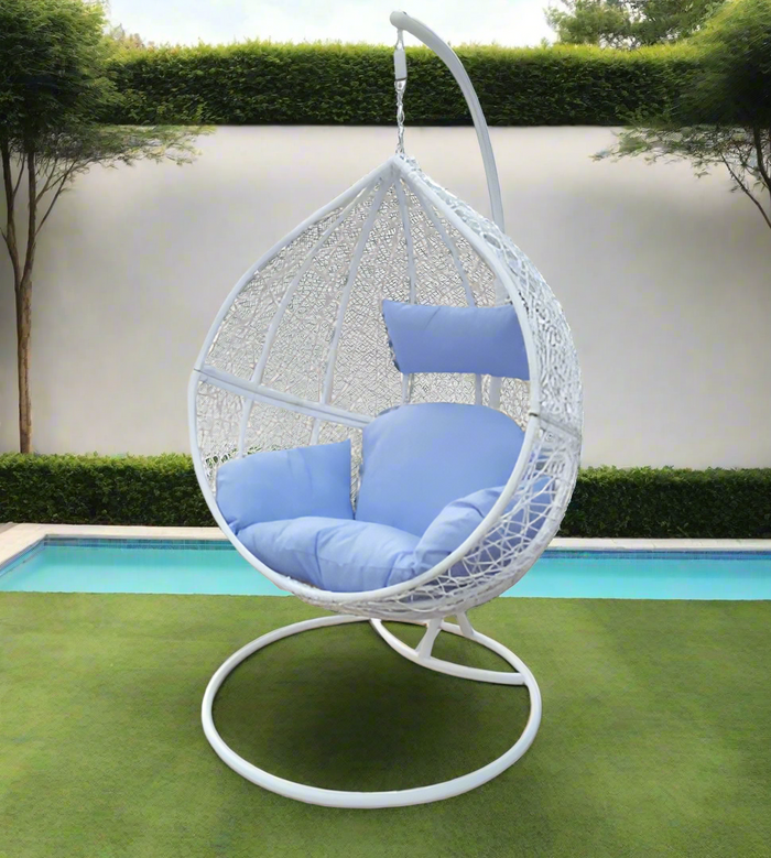 If you buy a White Wicker w/ Blue Cushions Egg Chair online from Siesta Hammocks in Australia we offer fast shipping and delivered to your home anywhere in Melbourne, Sydney, and other major cities.